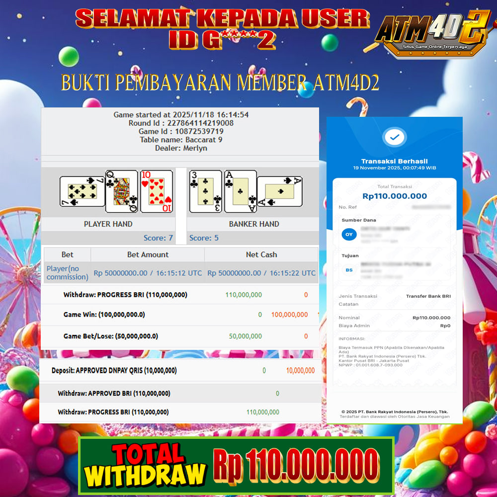ATM4D2 dikenal sebagai situs terpercaya yang selalu menghadirkan pengalaman bermain slot online yang aman, fair, dan berlisensi resmi. Di sini, kami tidak hanya sekadar memberikan janji, tapi bukti nyata berupa slip kemenangan yang dapat Anda lihat secara langsung.