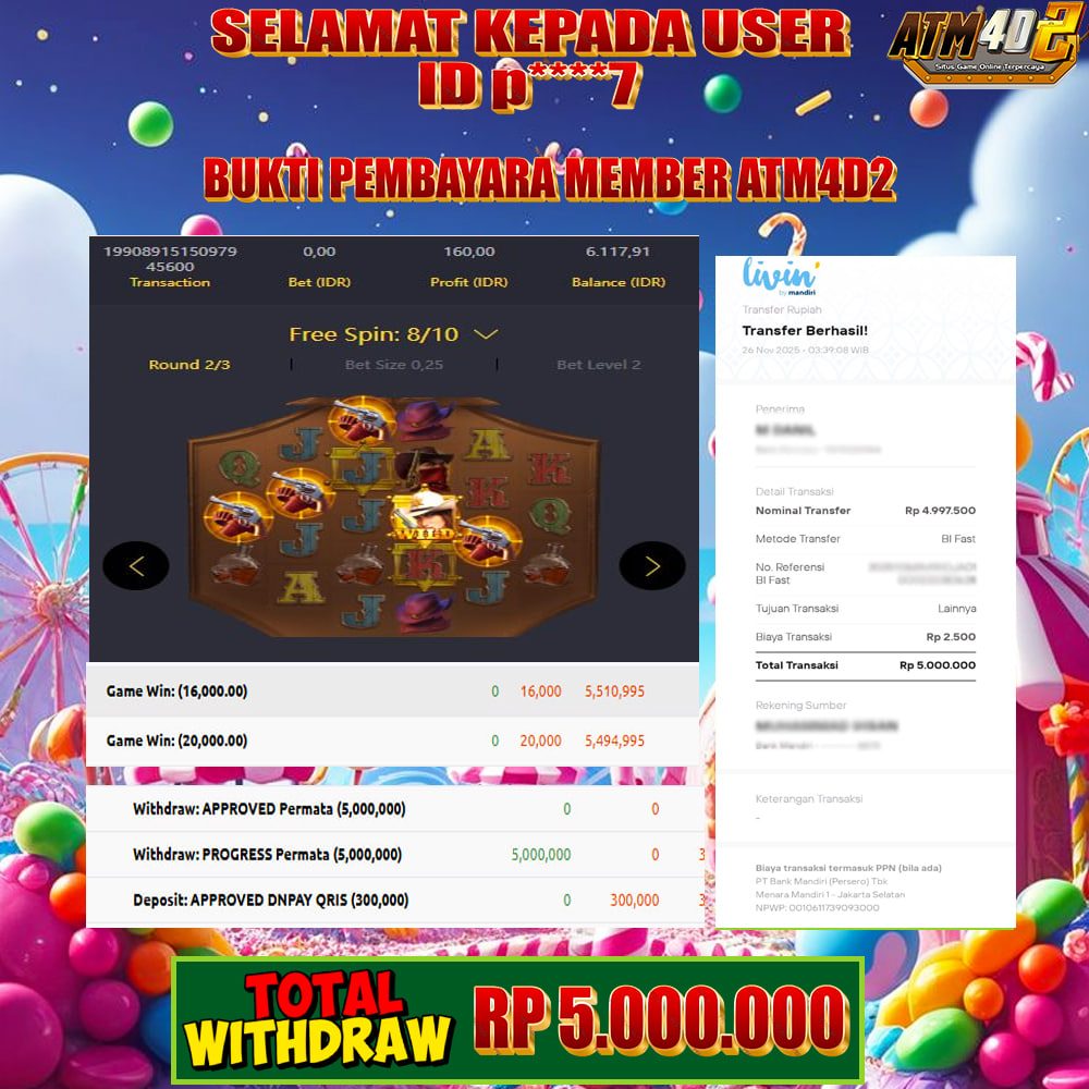 ATM4D2 dikenal sebagai situs terpercaya yang selalu menghadirkan pengalaman bermain slot online yang aman, fair, dan berlisensi resmi. Di sini, kami tidak hanya sekadar memberikan janji, tapi bukti nyata berupa slip kemenangan yang dapat Anda lihat secara langsung.