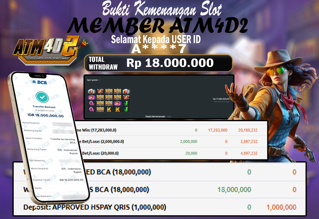 ATM4D2 dikenal sebagai situs terpercaya yang selalu menghadirkan pengalaman bermain slot online yang aman, fair, dan berlisensi resmi. Di sini, kami tidak hanya sekadar memberikan janji, tapi bukti nyata berupa slip kemenangan yang dapat Anda lihat secara langsung.