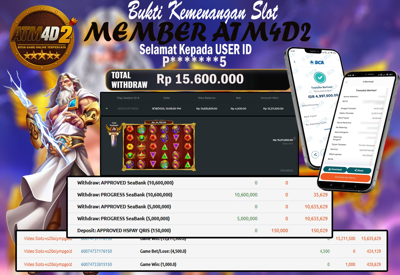 ATM4D2 dikenal sebagai situs terpercaya yang selalu menghadirkan pengalaman bermain slot online yang aman, fair, dan berlisensi resmi. Di sini, kami tidak hanya sekadar memberikan janji, tapi bukti nyata berupa slip kemenangan yang dapat Anda lihat secara langsung.
