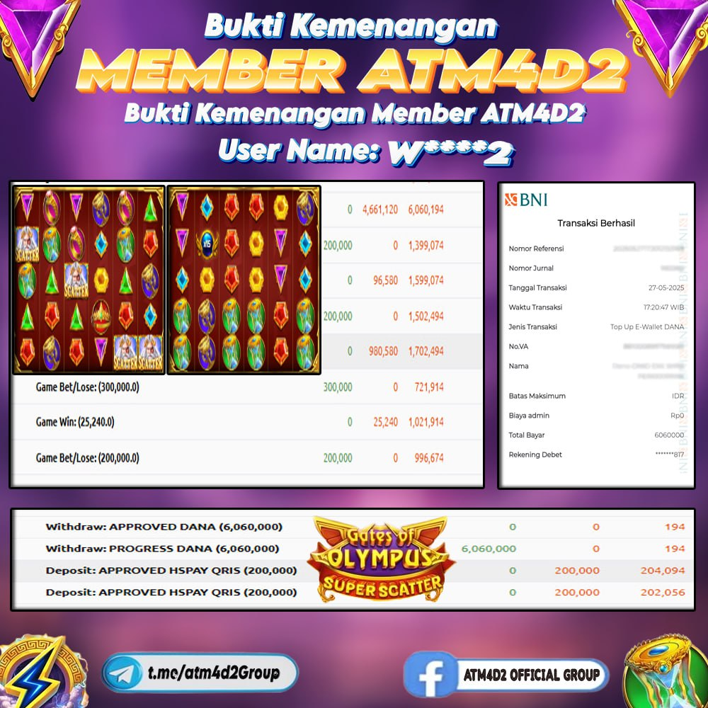 ATM4D2 dikenal sebagai situs terpercaya yang selalu menghadirkan pengalaman bermain slot online yang aman, fair, dan berlisensi resmi. Di sini, kami tidak hanya sekadar memberikan janji, tapi bukti nyata berupa slip kemenangan yang dapat Anda lihat secara langsung.