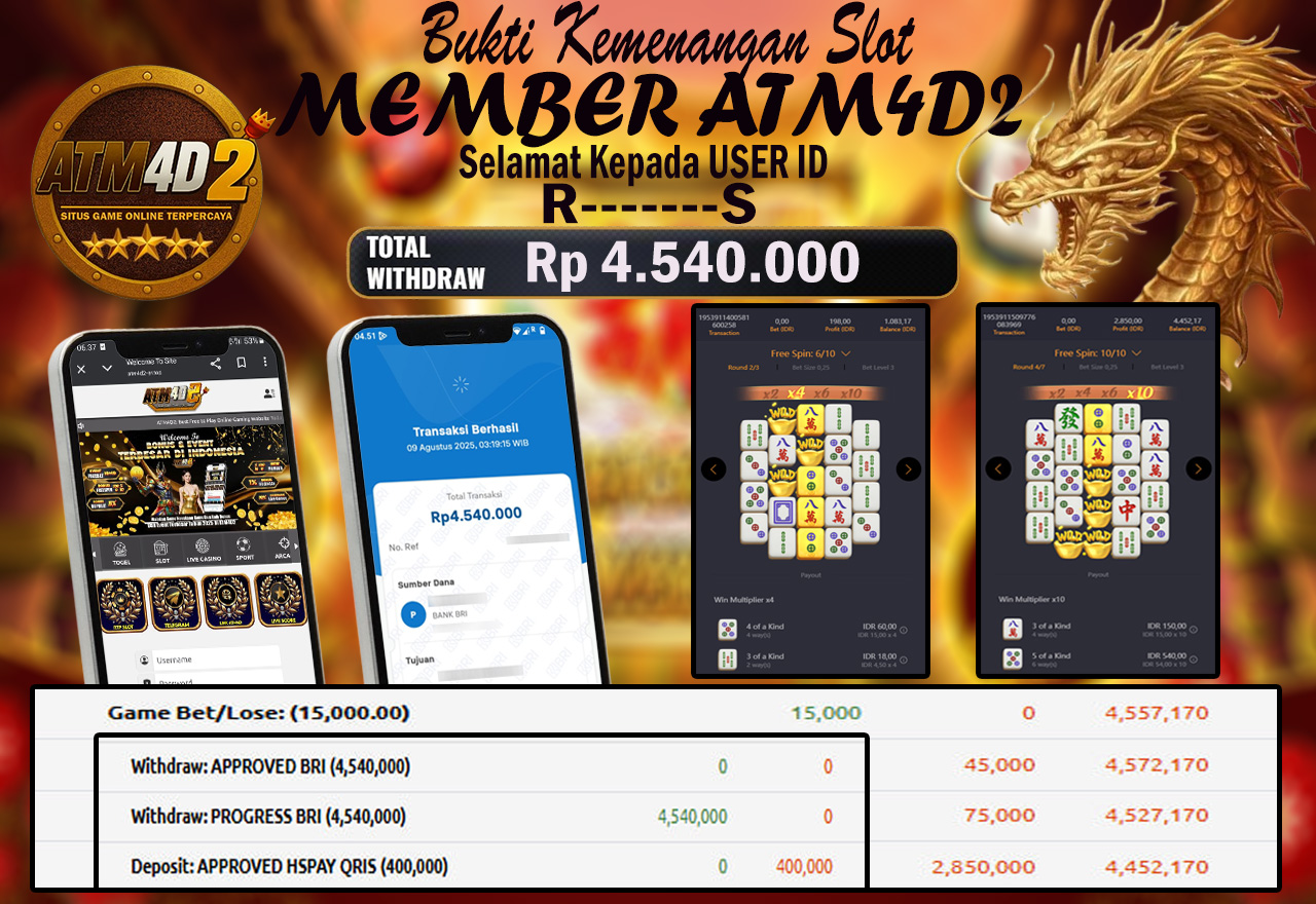 ATM4D2 dikenal sebagai situs terpercaya yang selalu menghadirkan pengalaman bermain slot online yang aman, fair, dan berlisensi resmi. Di sini, kami tidak hanya sekadar memberikan janji, tapi bukti nyata berupa slip kemenangan yang dapat Anda lihat secara langsung.