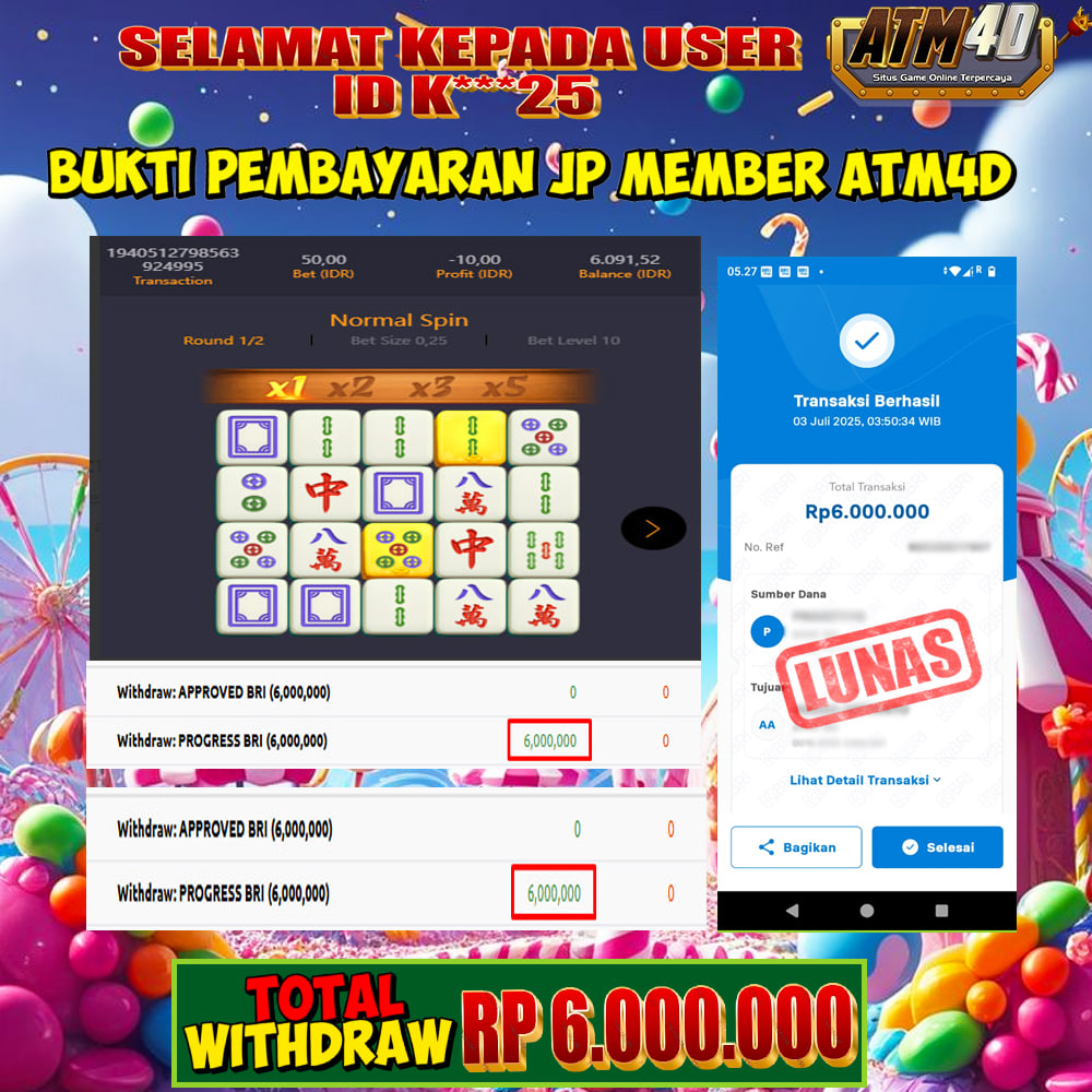 ATM4D2 dikenal sebagai situs terpercaya yang selalu menghadirkan pengalaman bermain slot online yang aman, fair, dan berlisensi resmi. Di sini, kami tidak hanya sekadar memberikan janji, tapi bukti nyata berupa slip kemenangan yang dapat Anda lihat secara langsung.