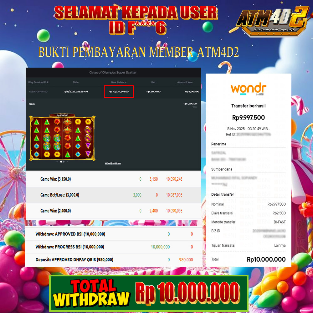 ATM4D2 dikenal sebagai situs terpercaya yang selalu menghadirkan pengalaman bermain slot online yang aman, fair, dan berlisensi resmi. Di sini, kami tidak hanya sekadar memberikan janji, tapi bukti nyata berupa slip kemenangan yang dapat Anda lihat secara langsung.